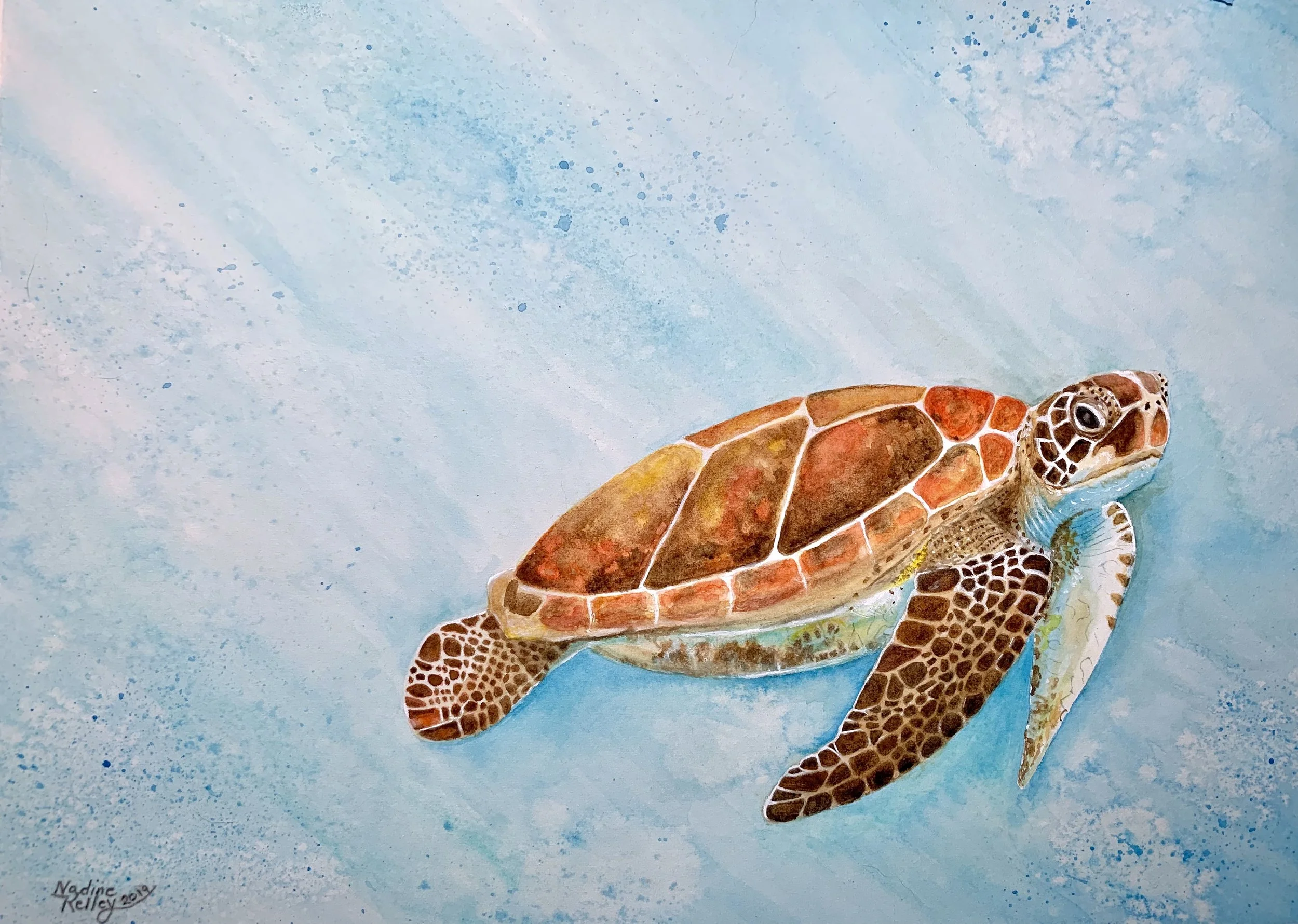 SOLD - Swimming Turtle, Watercolor & Gouache